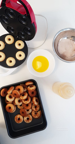 Preheat your oven to 200°c fan heat. Fill your donut trays about half way, you DONUT want to over fill or they won't come out as a ring. Cook for 7 - 9 minutes till skewer comes out clean.